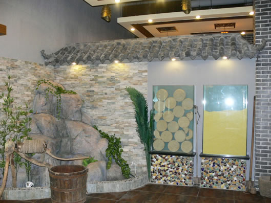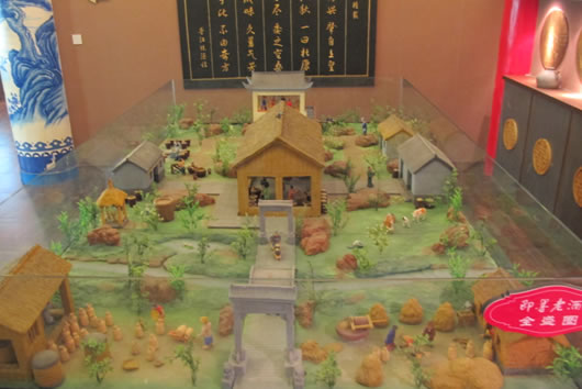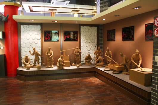 該展區(qū)主要用實物展示了釀造即墨老酒的三大生產(chǎn)原料,以及古代釀酒原料用的鍘刀、犁、斗等工具,以泥塑及文字的形式再現(xiàn)了“古遺六法”傳統(tǒng)釀造即墨老酒的工藝要求及操作流程,并以沙盤的形式再現(xiàn)了盛唐時期即墨老酒的全盛場景。